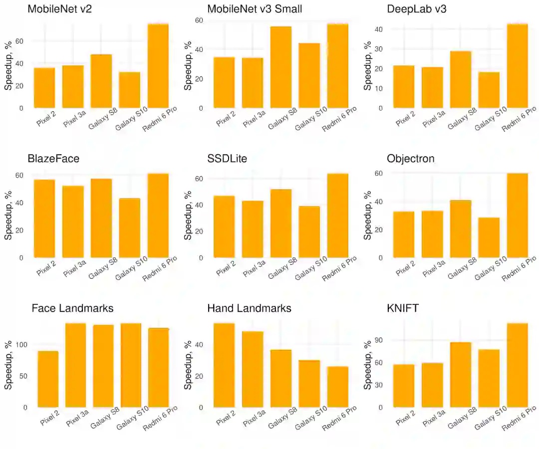 TensorFlow Lite 中经 XNNPACK 加速的推理已应用于生产环境的 Google 产品,我们也观察到其在各种神经网络架构和移动处理器上的速度得到了显著提升。XNNPACK 后端将 Pixel 3a Playground 中的背景分割速度提高了 5 倍,并将 ARCore 中 Augmented Faces API 的神经网络模型速度提升了 2 倍。