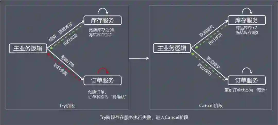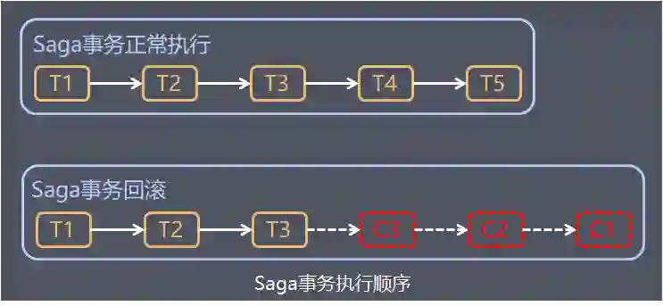 事务回滚:T1, T2, ..., Tj, Cj,..., C2, C1,其中 0 < j < n,例如:扣减库存(T1),创建订单(T2),支付(T3,支付失败),支付回滚(C3),订单回滚(C2),恢复库存(C1)。