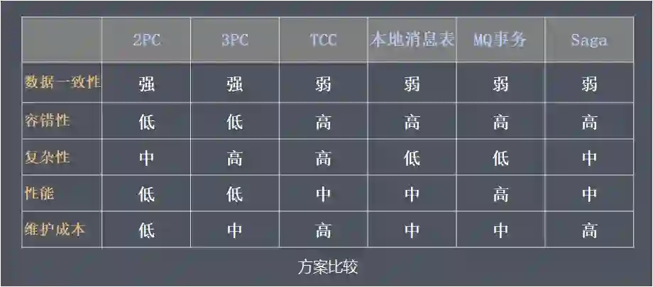 2PC/3PC:依赖于数据库,能够很好的提供强一致性和强事务性,但相对来说延迟比较高,比较适合传统的单体应用,在同一个方法中存在跨库操作的情况,不适合高并发和高性能要求的场景。