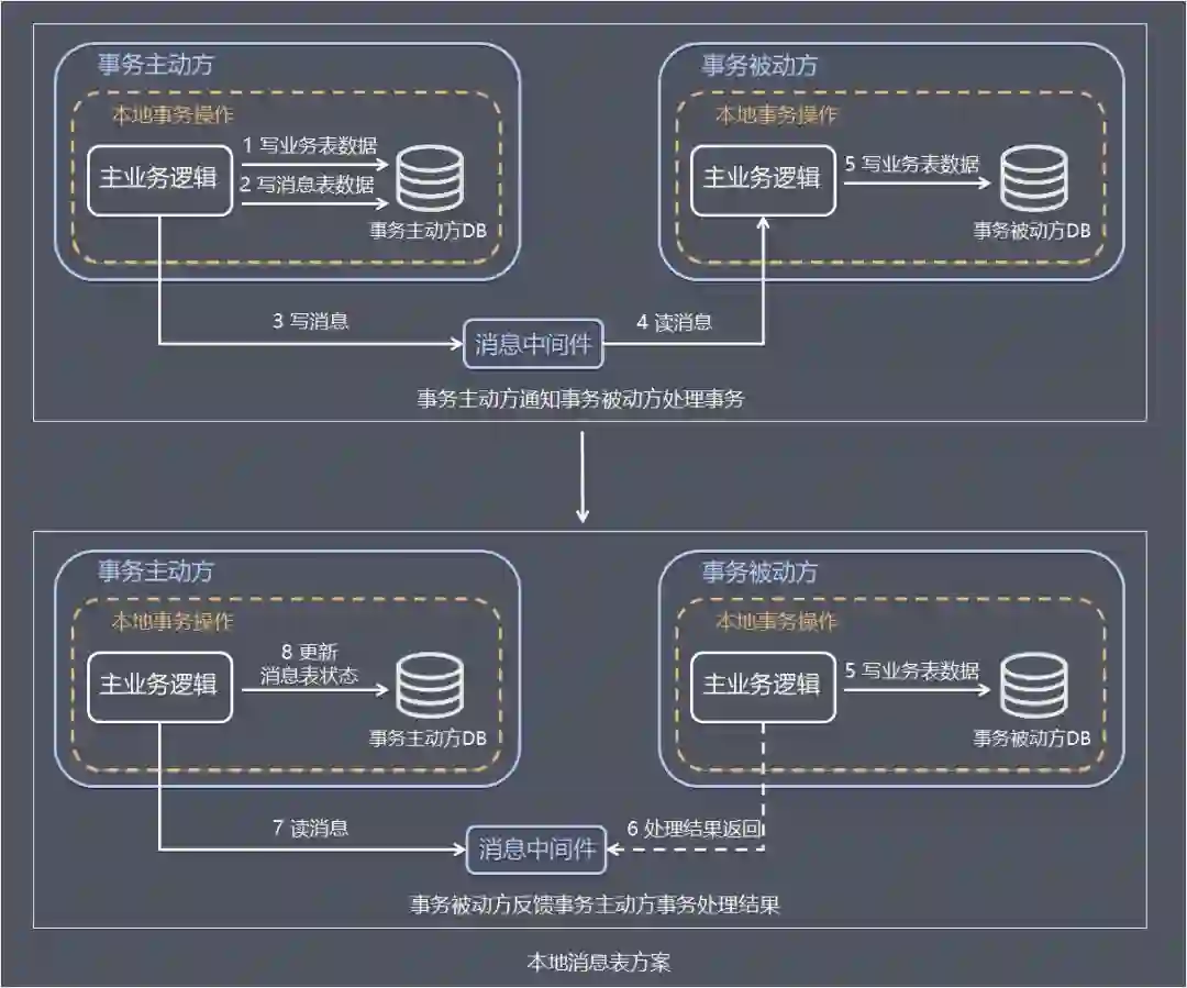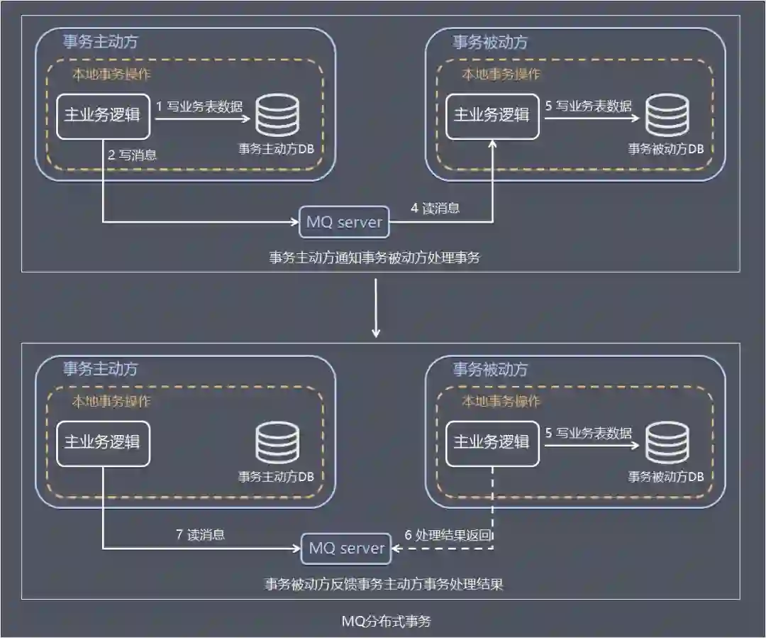 事务主动方基于 MQ 通信通知事务被动方处理事务,事务被动方基于 MQ 返回处理结果。
