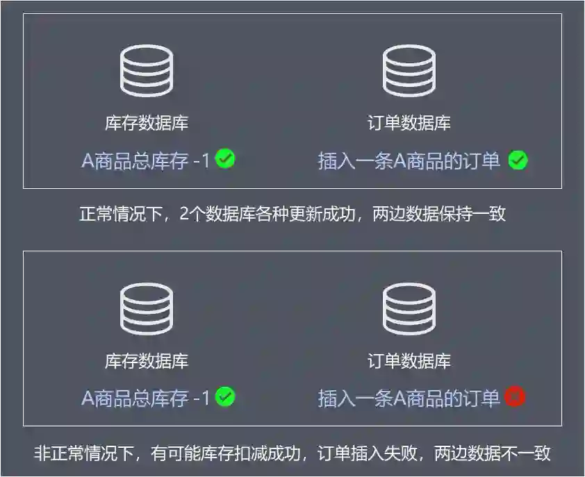 可以看到,如果多个数据库之间的数据更新没有保证事务,将会导致出现子系统数据不一致,业务出现问题。