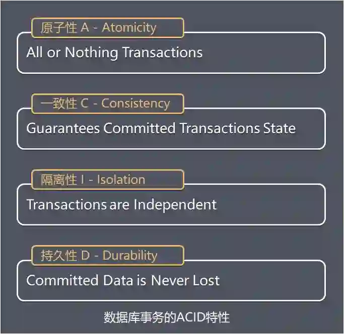 一个支持事务(Transaction)的数据库,需要具有这 4 种特性,否则在事务过程当中无法保证数据的正确性,处理结果极可能达不到请求方的要求。