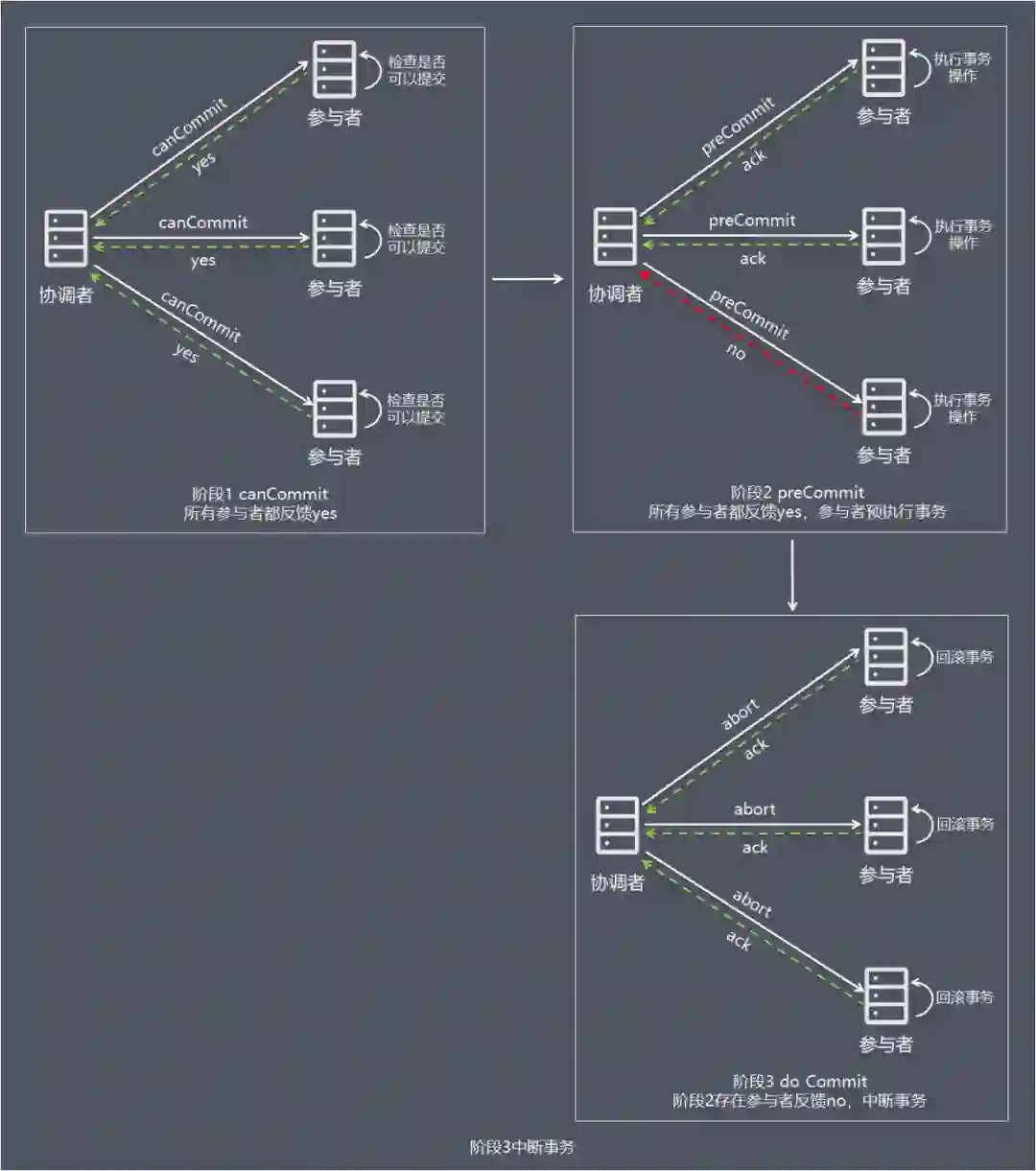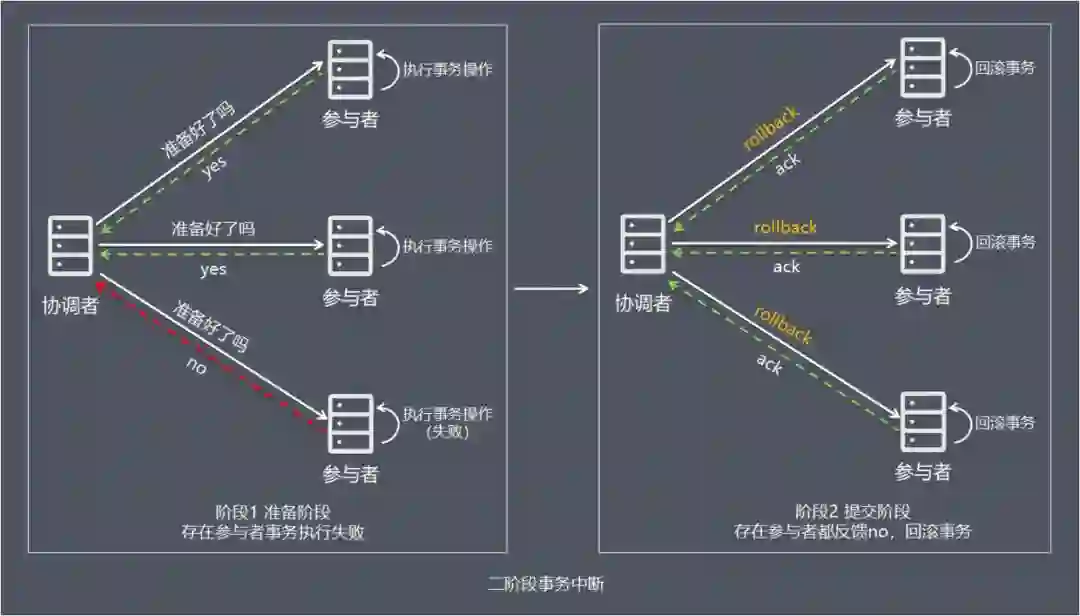 事务操作跨不同节点,当多个节点某一节点操作失败时,需要保证多节点操作的要么什么都不做,要么做全套(All or Nothing)的原子性。