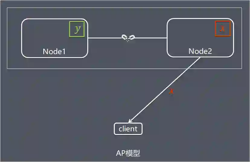 如上图所示,因为 Node1 节点和 Node2 节点连接中断导致分区现象,Node1 节点的数据已经更新到 y,但是 Node1 和 Node2 之间的复制通道中断,数据 y 无法同步到 Node2,Node2 节点上的数据还是旧数据 x。