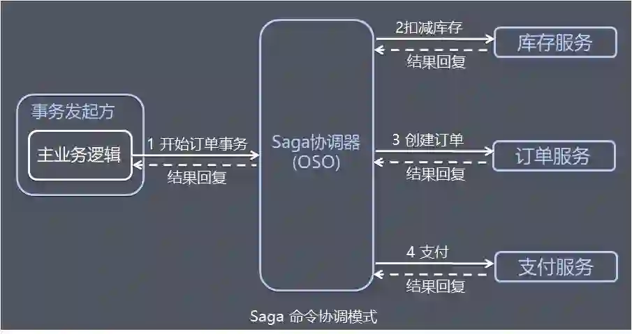 中央协调器(Orchestrator,简称 OSO)以命令/回复的方式与每项服务进行通信,全权负责告诉每个参与者该做什么以及什么时候该做什么。