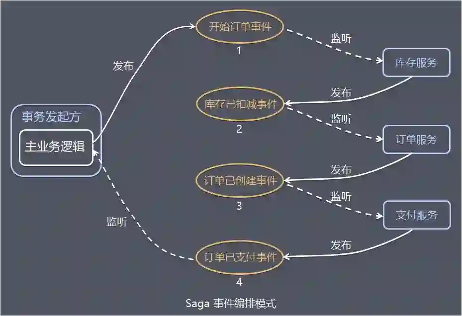 在事件编排方法中,第一个服务执行一个事务,然后发布一个事件。该事件被一个或多个服务进行监听,这些服务再执行本地事务并发布(或不发布)新的事件。