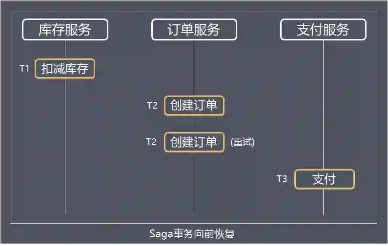 向前恢复(forward recovery):对应于上面第一种执行顺序,适用于必须要成功的场景,发生失败进行重试,执行顺序是类似于这样的:T1, T2, ..., Tj(失败), Tj(重试),..., Tn,其中j是发生错误的子事务(sub-transaction)。该情况下不需要Ci。