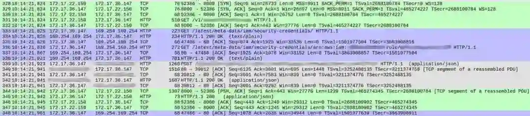 但在两次交换之间,蓝色部分占用了 86 毫秒。这到底是怎么回事?在数据包 333,我们的服务向 /latest/meta-data/iam/security-credentials 发送了一项 HTTP GET 请求,而后在同一 TCP 连接上,又向 /latest/meta-data/iam/security-credentials/arn:.. 发送了另一项 GET 请求。