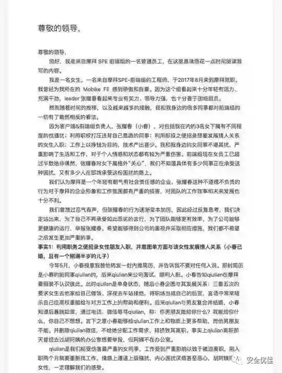 8月9日,网上流传一张图片显示,一位自称是摩拜单车的女员工发表举报信,称遭遇领导性骚扰。在举报信中,该员工表示,自己2017年8月入职的摩拜SPE前端组女工程师。摩拜客户端&前端组负责人张耀春对包括自己在内的3名女下属进行性骚扰,利用职权打压违背他意愿的同事,利用职权之便招录想要发展情人关系的女生入职等等。因此决定向公司举报。