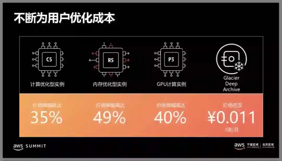 6月20日,AWS在技术峰会上海站宣布,在光环新网运营的AWS中国(北京)区域和西云数据运营的AWS中国(宁夏)区域,近期对Amazon EC2新一代5系列C5和R5计算实例,以及GPU加速计算实例P3进行了主动降价。根据客户所选的实例类型不同,客户可以看到27%到49%之间的降幅。