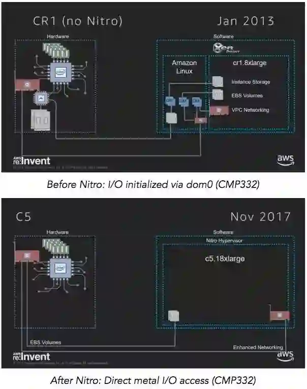 Nitro是基于ASIC芯片的系统,直接部署在云数据中心的物理服务器上,直接接管原本需要在CPU上运行的Hypervisor做的事。