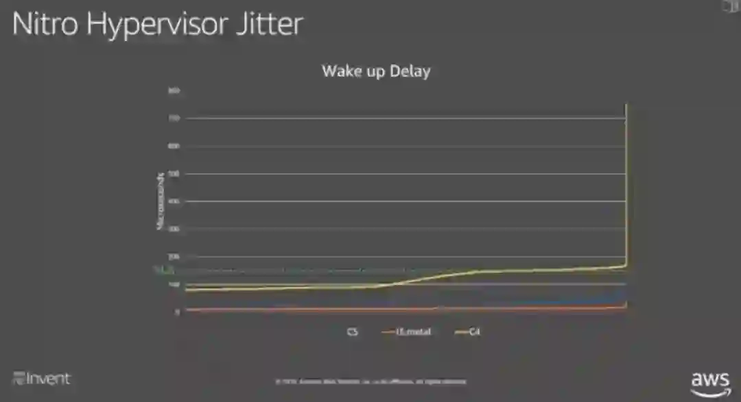 把原来虚拟机承载的作业交给专有硬件后,带来了很多变化,最主要的就是性能上的提升。AWS首席技术布道师Jeff Bar在一篇博客里写道:部署Nitro Hypervisor的实例跟裸机服务器主机相比,性能只相差大约1%,基本可以忽略。上图来自2018年AWS re:Invent大会keynote:采用Nitro Hypervisor的C5实例与没采用Nitro的早期实例、裸机服务器主机的唤醒时延对比,C5主机表现与裸机服务器主机差别非常小。