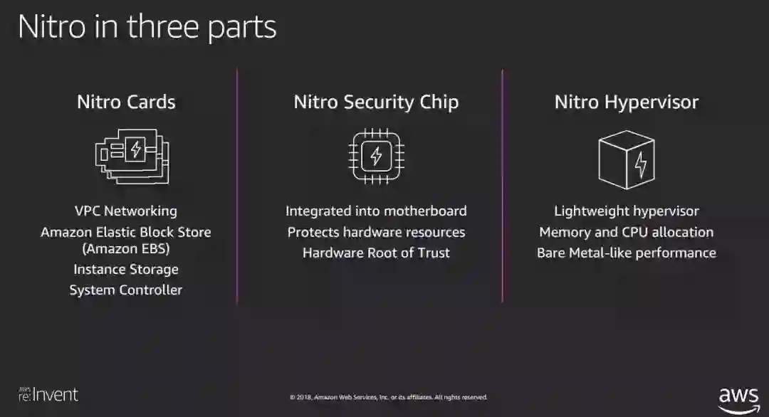 通过上图可以直观看出,Nitro架构基础之上,系统构建的复杂度明显降低。实际实现中,Nitro分为三大方向,彼此相互独立。