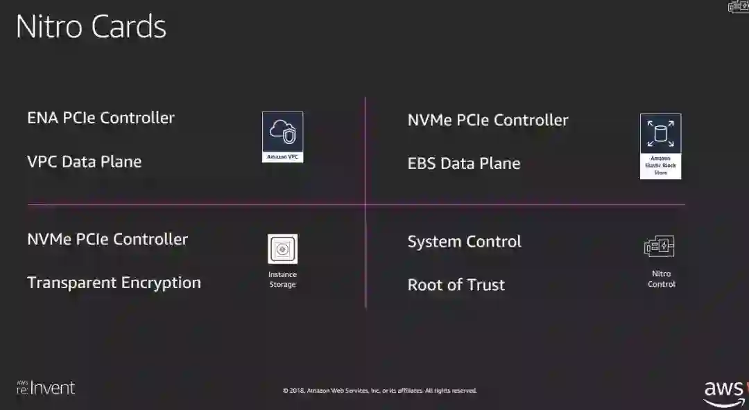 NitroCards:专有硬件承载存储、网络功能,以及控制EC2实例的业务逻辑;