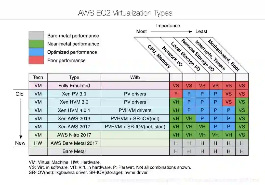 引入Nitro是AWS EC2极具突破性的创新。上图回顾总结了EC2虚拟化技术的变迁史,历代更新中,从纯软的虚拟化到半虚拟化,硬件直接参与度越高,性能越好。最开始,连CPU和内存都是虚拟的,后来,通过ASIC硬件运行基于KVM的Hypervisior取代了原来的Xen虚拟化方案,CPU、内存、网络、存储都演变成硬件支撑,真正意义上实现硬件虚拟化,性能大幅提升。