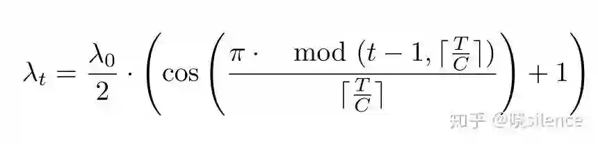 这篇文章是2017年在ICLR上的一篇文章,作者是densenet的一作,这篇CVPR的文章中也就采用了这种训练一次得到多个模型的思路,进行了对上述的 Boot 方法需要多个初始化得到多个模型的弊端进行了改进,利用的是余弦退火法,通过周期性地改变学习速率以得到多个不同的模型,使用的学习速率的公式为: