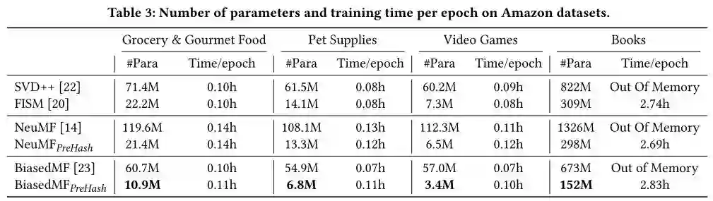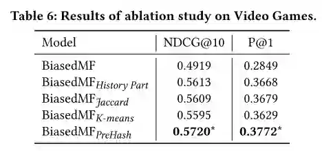 「去除hash part,只包含history part的效果已经比较好」 。因为在矩阵过于稀疏时,矩阵分解中的潜向量很难捕捉到用户历史和偏好。但是「history part可以捕捉到」 。
