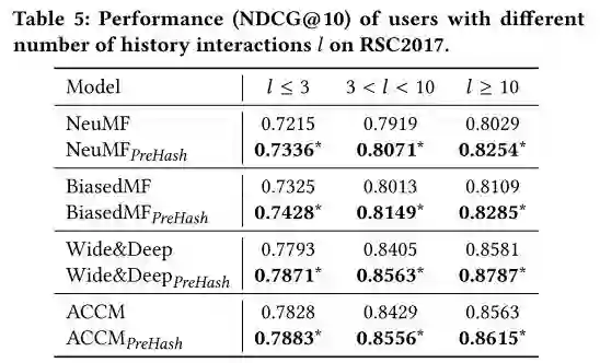 实验结果表明,效果在三个部分都有提升。PreHash好的原因是在hash部分 「显式得利用到了同组频繁用户」 (warm user)的偏好。
