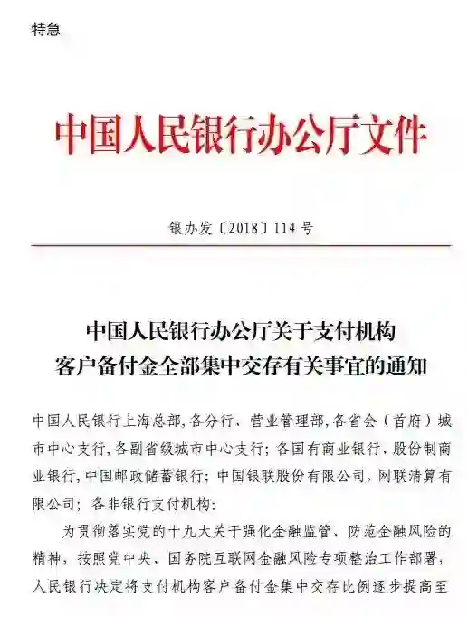 央行支付结算司近日下发《中国人民银行支付结算司关于支付机构撤销人民币客户备付金账户有关工作的通知》的特急文件,其中指出,支付机构能够依托银联和网联清算平台实现收、付款等相关业务的,应于2019年1月14日前撤销开立在备付金银行的人民币客户备付金账户。