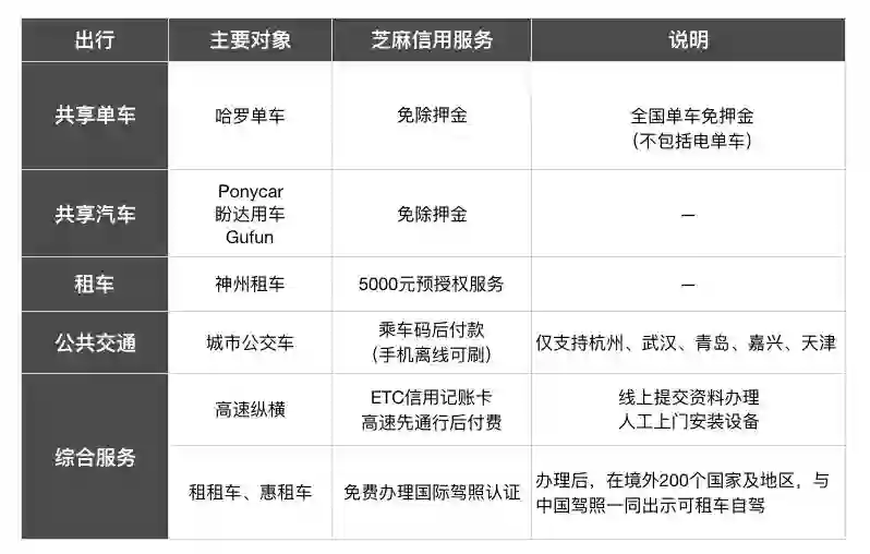 在出行领域中,芝麻信用的服务主要体现在:共享出行、租车、公共交通以及其他综合服务。当芝麻信用分值达到厂商要求区间时,我们便能享受到信用带给我们的利处。
