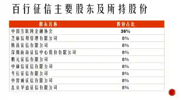 今年 2 月份,获得央行发出首张个人征信服务牌照、真正意义上的国内首家民间个人征信机构——百行征信,正式在深圳揭牌,一个全新的个人征信系统出现了。根据公示信息看,百行征信是由中国互联网金融协会与首批 8 家个人征信试点机构共同出资,其中中国互联网金融协会持股 36%,8 家机构各持股 8%: