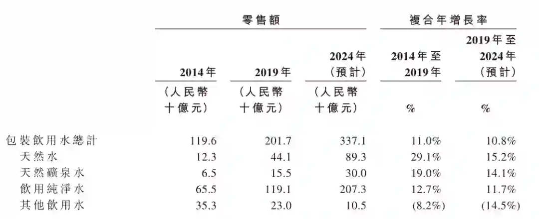 虽然天然水和天然矿泉水的年复合增长率,是目前包装饮用水中发展最快的,但从零售额来看,依然是较小的市场。数据显示,到2024年,天然水和天然矿泉水的零售额,预计分别达到89.3亿元和30亿元,加起来占到整个包装水市场的35%左右。