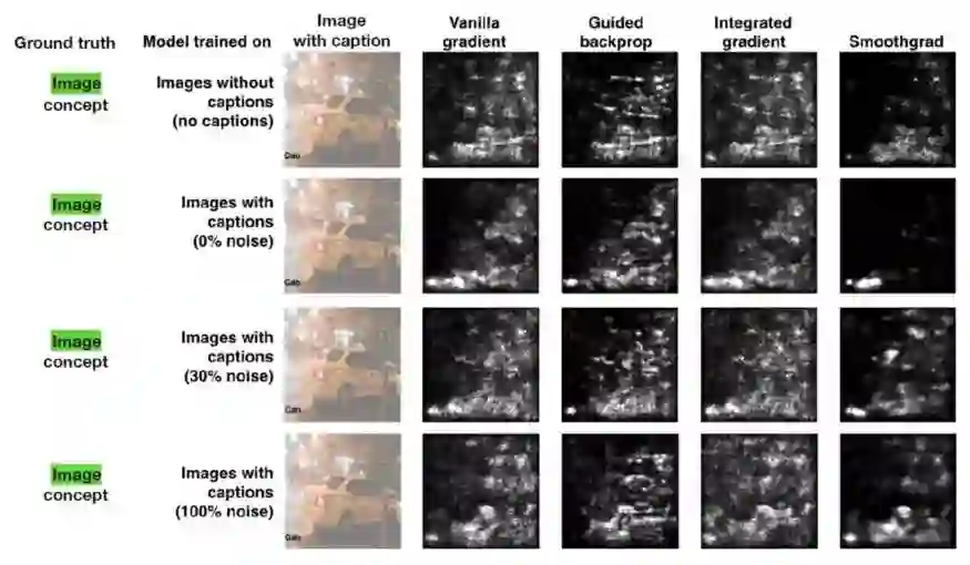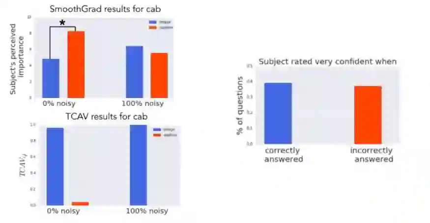 实验的基本事实是图像概念比标题概念更相关。然而,看显著图时,人们认为标题概念更重要(0%噪声的模型),或者辨别不出差异(具有100%噪声的模型)。相比之下,TCAV结果正确地表明图像概念更重要。