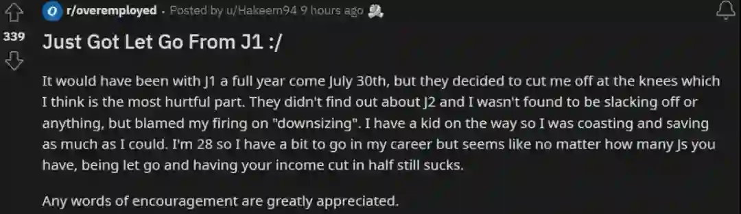 还有不少人在 reddit 社区晒出了自己 Overemployed 期间被裁员的经历,这些人并没有被雇主发现自己从事多份工作,但还是因为公司大客户流失等原因被裁了。此时,他们不得不感叹,还好有另一份工作托底。
