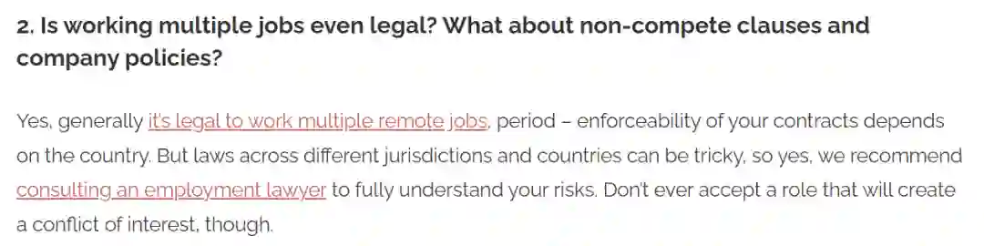 在网站的问答版块,Isaac P. 列出了一些问答来帮助人们跨越身兼多职的门槛,常见问题包括:「做多份工作违法吗?有竞业协议怎么办?」「第二份工作是找大公司还是小公司?」「我可以在另一个国家找第二份工作吗?」「公司可否在未经我同意的情况下合法查询我的受雇情况?」可见,这种工作方式还是存在一些法律风险的。