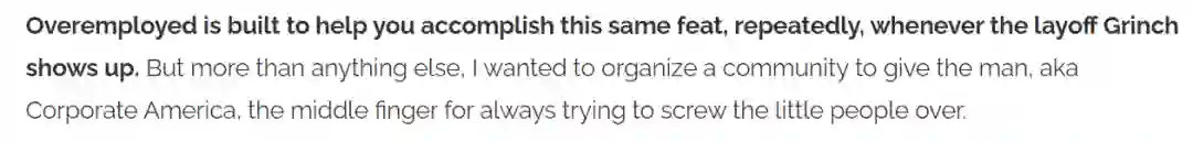 在此期间,Isaac P. 成立了这个名为「Overemployed」的社区。在他看来,Overemployed 是一种对冲裁员风险的有效方式。他在自述中写道,「我想组织一个社区,向美国企业界竖中指,因为他们总是试图欺负小人物。」
