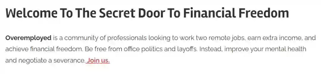 这些人聚集在一个名叫「Overemployed」的网站,网站的首页写道:「『Overemployed』指的是一群希望做两份远程工作、赚取额外收入并实现财务自由的专业人士。远离办公室政治和裁员,改善你的心理健康,做好离职补偿金协商。」