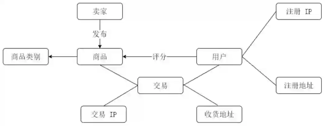 对于一个简单的电商的图,其包含卖家,商品和用户三个关键节点,其中,商品节点关联商品类别节点,用户节点关联注册 IP 节点和 注册地址节点。当用户在购买商品时,用户节点和商品节点就会关联交易节点,同时,交易节点也会关联用户下单时所对应的 IP 节点以及收获地址节点,对应的图结构如下图所示。