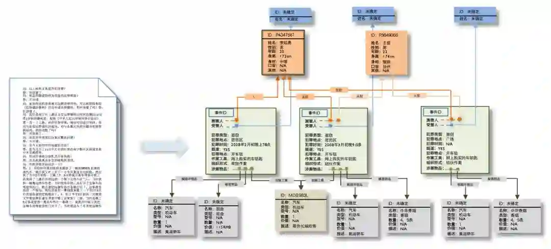 • 公安案情结构化:这个系统对公安侦破过程中的文本信息进行解析,构建关于案情的人-事-物-时-地的知识图谱(见图12),让机器“懂”案情,从而为刑侦人员提供串并案、犯罪预测、信息比对及融合等决策辅助。公安案情结构化是OONP的一个成功应用,充分发挥了神经符号系统在解析复杂文本上的优势。公安案情结构化任务的复杂性体现在多个方面,其相关文本形式多样,叙述逻辑繁复曲折,而且最终的知识表示是包含多事件、多实体、多标签以及时空关系的庞杂图谱。为了将文本中特定的叙述习惯等知识作为规则嵌入OONP并获得泛化能力,我们利用了Neural Rule Engine来处理理解过程中的特定子任务,取得了较小数据量下的显著效果。