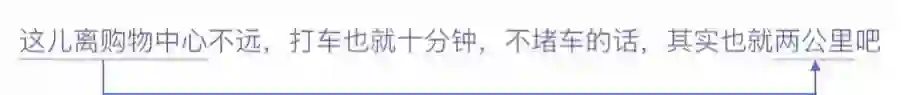自然语言形成的文本中,常常有长距离的逻辑关联。这种逻辑关联既包含来自语言结构的依存关系,也包含语义层面上的逻辑关系,而且二者互相渗透。以下面的句子为例,它包含了一个语义信息“这里距离购物中心两公里”,但是要做出这个判断,需要跨越句头和句尾中间的距离,依靠语义上的连续性来发现前后的逻辑关联。这种逻辑关联,往往很难靠类似循环神经网络(RNN)这样的简单序列处理模型来发现和利用。