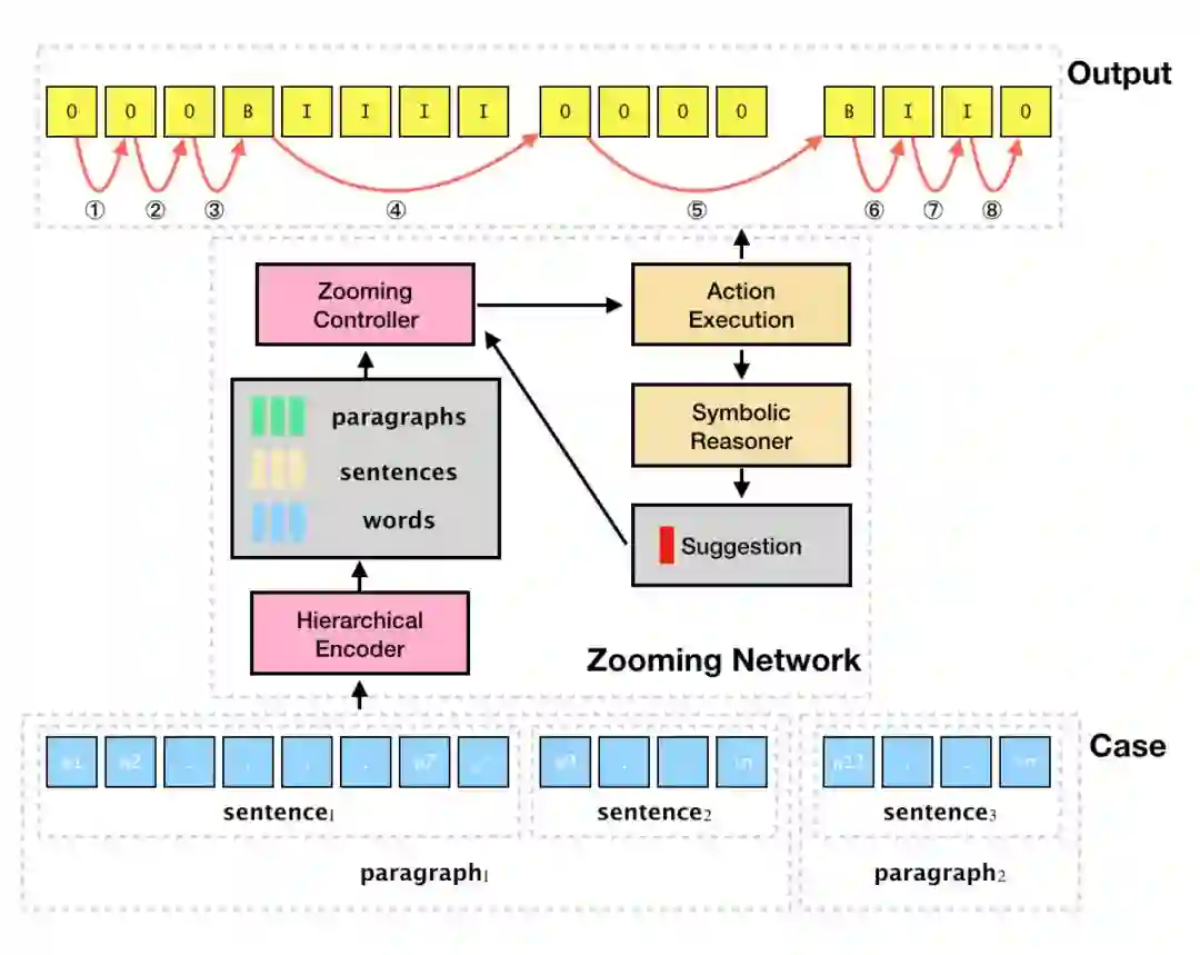 段落、列表等文本结构蕴涵着信息输出者的表达策略,对于准确抓取、理解文本内容有着重要的意义。这种文本结构有符号化的骨架,但是又需要和局部的语义有深度的耦合。我们提出了变焦神经网络(Zooming-Net)来完成这种偏符号性的文本结构和神经性的局部语义表示的结合。Zooming-Net可以利用Policy-Net灵活地选择在特定文本粒度(字、句、段)上执行读取、更新、跳转、预测等一系列操作,这种独特的变焦处理方式高度类似人类阅读过程,利用文本结构,其在信息稀疏部分进行泛读,确保不引入过多噪声,在信息密集部分进行精读,确保有用信息不被丢失。我们引入了符号化推理模块对模型的输出加以解释,并进行定向的干预。变焦神经网络由层次化编码器、变焦控制器和符号化推理模块三个部分完成对文本的处理并以序列标注的形式找出文本中的关键片段(图6给出了一个简略的示意图)。具体地说,在每个时刻,层次化编码器配合变焦控制器有策略地选择建立层次化特征,读取特定层级的信息,结合符号化推理模块给出的临时性离散信息预测出一定长度的标签序列。在读取整篇文本之后,将各时刻输出的标签序列进行组装,并取出对应的关键信息片段。实验表明,借助句段结构信息,变焦神经网络很好地结合了泛读与精读过程,其可以更好地对长时依赖特征进行建模,并引入大跨度动作提高效率,在关键信息的抽取任务上,f1值较经典序列标注模型(biLSTM+CRF)有10%以上的提升,预测行为频次减少50%以上。变焦神经网络非常适合应用在各类长文本处理任务当中,其使用的编解码方式也可结合其他技术推广到各类自然语言处理任务过程中 (论文见arxiv.org/abs/1810.02114 )。