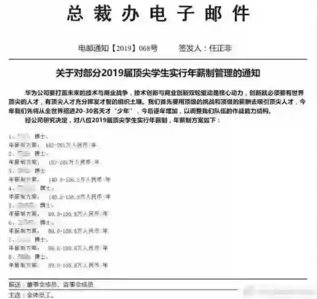 有消息称,华为总裁办签发的最新电子邮件显示,华为对部分2019届顶尖学生实行年薪制管理,年薪为100万~200万元不等。