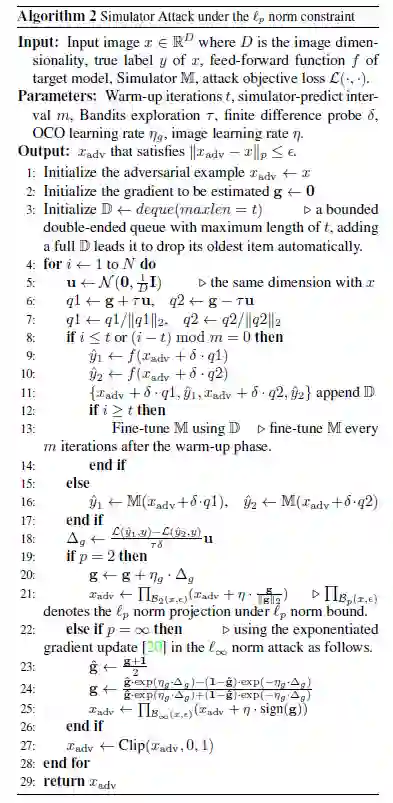 模拟器攻击的算法流程如算法 2 和图 4 所示,它沿袭了 Bandits 攻击的逻辑,值得注意的是第 8 行至第 17 行:在刚开始攻击的 t 个迭代内(warm-up 阶段),query 直接被输入到目标模型中,并且使用一个双端队列
