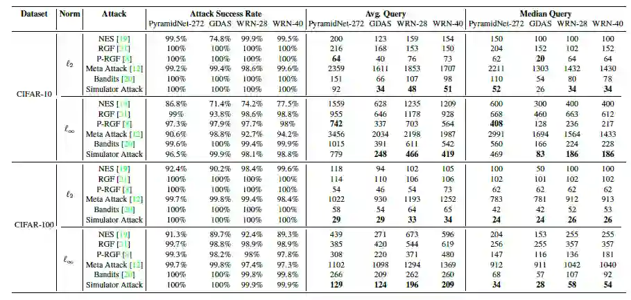 模拟器攻击首次解决了这个问题,Simulator 在训练的阶段中没有与目标模型有任何交互,仅仅是攻击时花费少量的查询,便可以极大地节省攻击的查询量。总结一下,模拟器攻击在训练阶段时使用大量不同的现有模型生成的训练数据,并且将知识蒸馏损失函数应用在元学习中,这样在测试的时候就可以模拟任何未知的黑盒模型。