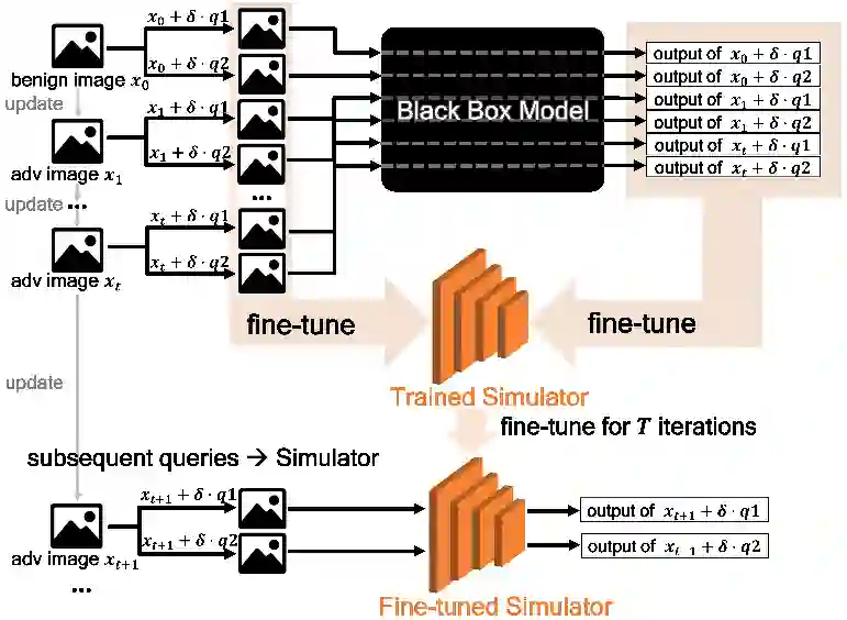 模拟器攻击(Simulator Attack)这篇论文致力于降低 query-based attack 的查询复杂度,因为假若攻击单个样本仅需要两位数的查询量时,该攻击便具有现实威胁。研究发现,任何黑盒模型都可以被一个相似的代理模型(即模拟器)所替代,如果能将一部分查询转移到这个模拟器上,那么真正的目标模型的查询压力便随之降低。