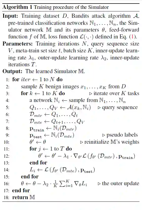 图 3 和算法 1 展示了模拟器攻击的训练过程。首先找一些真实图片作为输入,用黑盒攻击算法(Bandits)攻击一个随机选择的分类网络生成 query sequence,这些 query sequence 都是攻击中间数据,被存储在硬盘上。另外除了 query sequence,它们对应的那个分类网络的输出 logits 也被存储在硬盘上,被称为“伪标签”(即 pseudo label)。