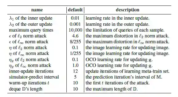 在 targeted attack 中,该研究设置 target label 为原始(true label+1)%class_number。对比方法该研究选择 NES、RGF、P-RGF、Meta Attack 和 Bandits,其中 Bandits 作为基准。方法设置参数可参见表 1: