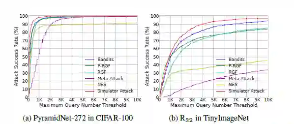 表 2 - 表 5 展示的 10000 次查询限制下实验结果,而不同的最大查询预算限制下的成功率见图 6。可以得出结论:模拟器攻击相比于 Bandits 攻击和其他攻击,可以将查询复杂度降低几个数量级而不改变成功率。这一结果同样也显示在攻击防御模型的结果中(表 6)。