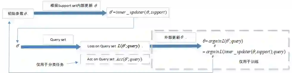 Support set & query set: 每个 task 分成 support set 和 query set 两个子集。Support set 对应于算法中的内部更新,query set 对应于算法中的外部更新。在本论文中,support set 被命名为 meta-train set,query set 被命名为 meta-test set。