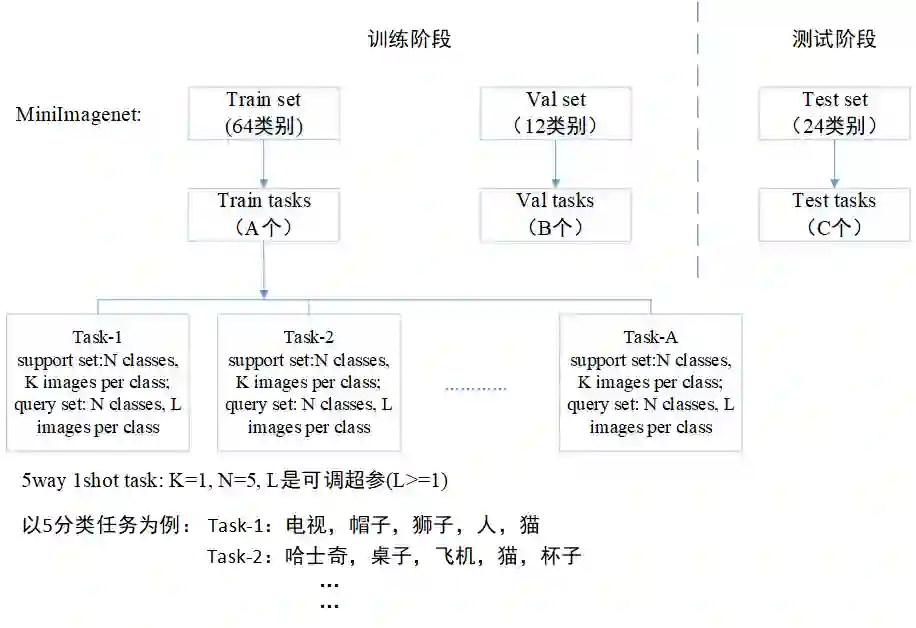 图 1 展示了一个典型的 K-shot 的元学习方法的一般套路,其训练阶段的数据和测试阶段的数据包含不同的类别,而训练的每个 task 又被切分成 support set(又名 meta-train set)和 query set(又名 meta-test set)。