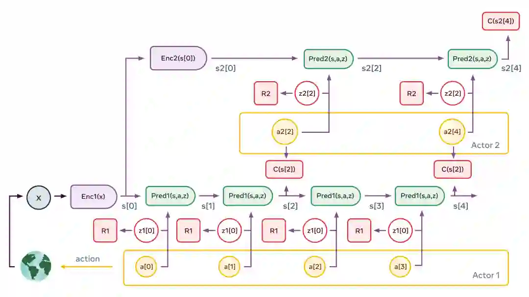 一个典型的感知-行动情节如上。该图说明了两级层次结构的情况。感知模块提取世界状态的分层表示(图中 s1[0]=Enc1(x) 和 s2[0]=Enc2(s[0]))。然后,在假设二级行动器提出的一系列抽象动作的情况下,多次应用二级预测器来预测未来状态。行动器优化二级动作序列以将总成本最小化(图中的C(s2 [4]))。