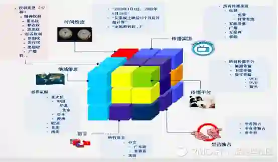 分类存档这个问题有这么几个维度。首先在目前内容行业里,所有的作品细分“穿透“实质上有四种大的类型,视、音、图、文,以及这四类的结合作品。按作品类目先做区隔。其次,著作权的有效性都来自于合同的签署,没有签约合同的约定,IP的著作权就不被确认,我们通常也把这个叫做确权的过程,基于确权的情况下就要按照权利来源做第二个维度,比如是自制(职务创作、法人作品)、合制、委制、引进(购买、租赁)、交换、赠与。第三点事对于每个IP细分后的权利维度的管理,对于著作权而言复杂的不在于IP分类存档,版权管理的目的是在于能够有效方便快捷的查询到相应的权利并加以运营,所以我们就需要构建一套基于著作权描述的标准框架。这部分我提出过一套(版权数据魔方CMCS)的概念,具体可以参看下图: