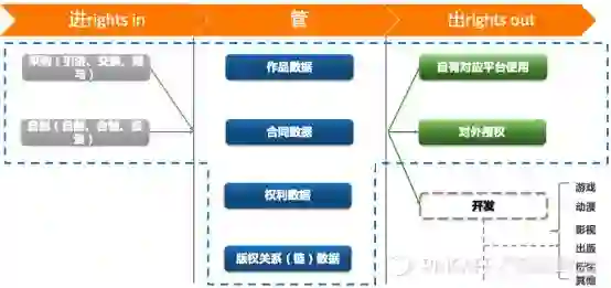 这个库具体管的或者数据流不是内容作品的流媒体文件,也不是交错复杂的各类申请单流程单,这个库最为核心管理的是作品以及围绕作品的权利属性,基于这样的主数据去配合数据产生的流程管理相关的其他数据信息,比如版权合同前身过程中产生的版权数据与合同数据,运营分销过程中产生的版权数据与合同数据。简单的流程来看就是rights in与rights out两个环节,以及围绕这个环节上下游契合版权的所有信息。