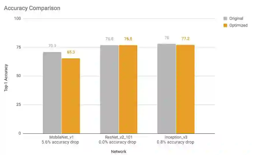 TensorFlow 通过将参数(即神经网络权重)的精度从训练时的 32 位浮点表示降至小得多且高效的 8 位浮点数表示,来进行优化(也称为量化)。详细信息请参见训练后量化指南。地址:https://www.tensorflow.org/performance/post_training_quantization