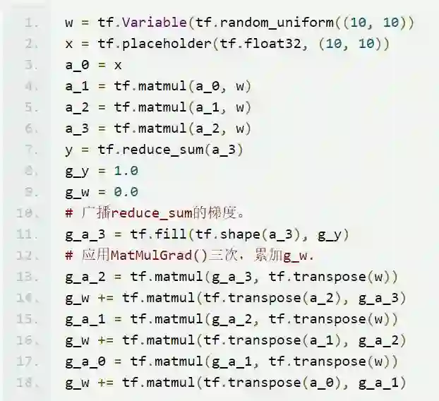 那么动态控制流构件是如何支持 TensorFlow 的 autodiff 算法执行后向传播的?数据流图中,每个操作关联到一个“控制流上下文”,它指定了最内层的控制流构件,其中的操作是由各个构件组成。当后向传播变量首次遇上的新控制流上下文时,它就在梯度计算数据流图中生成一个相应的控制流构件。这样,输出梯度g_z的操作tf.cond(pred,true_fn,false_fn),其梯度为tf.cond(pred,true_fn_grad(g_z),false_fn_grad(g_z))。而对于tf.while_loop(cond,body,loop_vars),下面的代码显示了如何静态展开循环体,并对tf.matmul()和tf.reduce_sum()应用梯度计算函数。