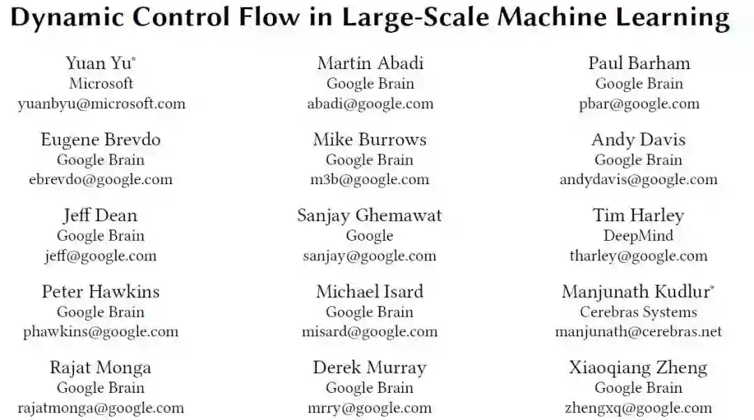 论文介绍了一种使用动态控制流实现机器学习的编程模型。该模型设计支持异构设备间的并发和分布执行,可以使用 CPU、GPU 及 TPU 等定制 ASIC 计算,支持应用在多设备间的频繁控制流决策。模型已在 TensorFlow 中实现,并得到了广泛地使用,对机器学习的进展做出了贡献。